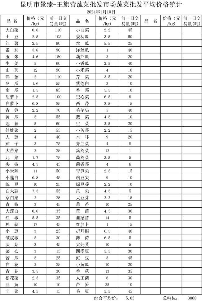 • 市場(chǎng)平均價(jià)格統(tǒng)計(jì)2024年1月10日