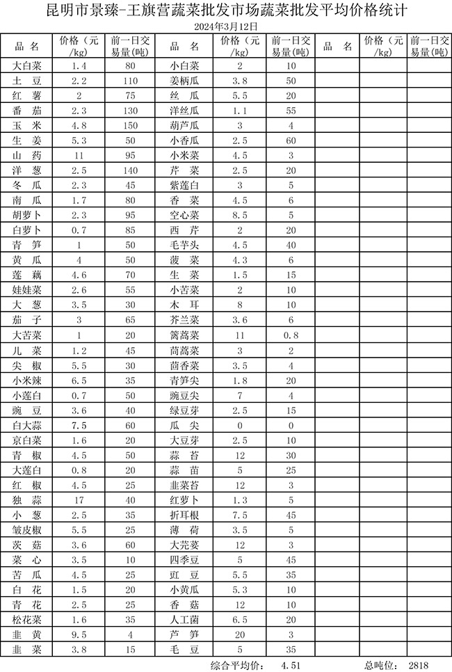 • 市場(chǎng)平均價(jià)格統(tǒng)計(jì)2024年3月12日
