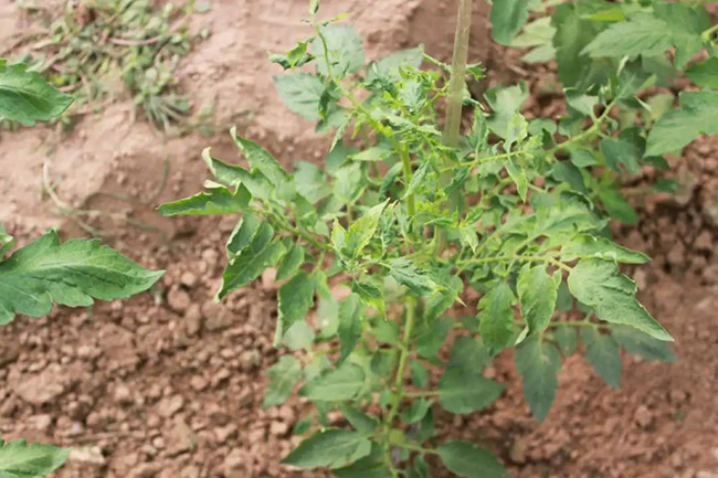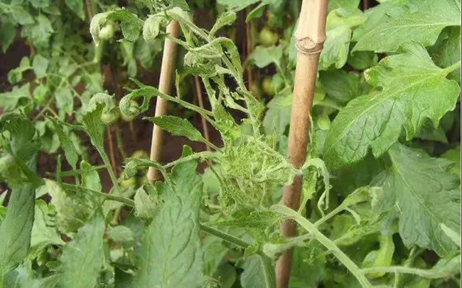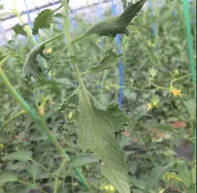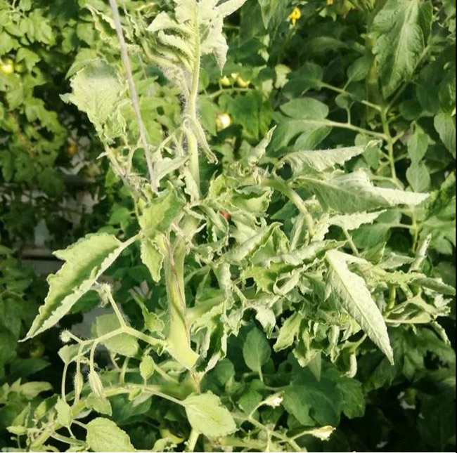判斷方法:番茄葉面常出現(xiàn)褪綠、變窄、變小、葉面皺縮,上部葉片卷葉更明顯,并且有發(fā)病中心點(diǎn)。