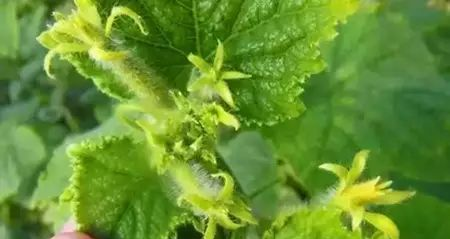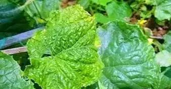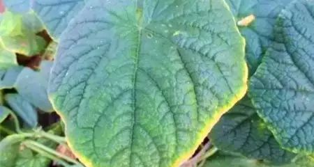 當(dāng)黃瓜缺硼時(shí)葉片會(huì)出現(xiàn)皺縮。葉片沿葉脈皺縮,葉脈扭曲,葉片外卷畸形,葉緣不規(guī)則褪綠黃化,黃化部位呈線狀。嚴(yán)重時(shí)生長(zhǎng)點(diǎn)附近的葉片萎縮干枯。